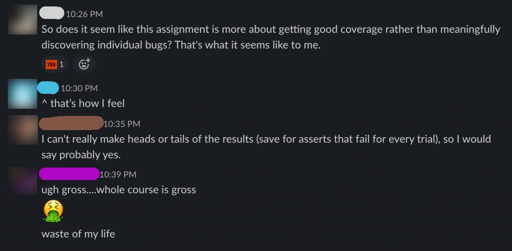But this lack of feedback is exceptionally disappointing in a class that’s has you write literally hundreds of lines of tests of your own design only to hear NOTHING back.