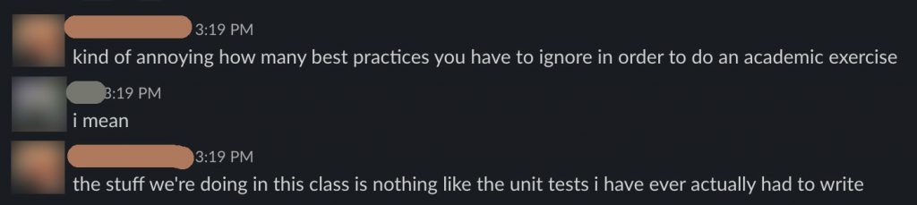All this class does is have students write the same kinds of tests on the same (broken) code over and over and over until the end of the quarter. If you walk away from this class hating testing or unconvinced of its importance, please know that this class isn’t representative of what it’s like to write and maintain tests in a professional capacity.