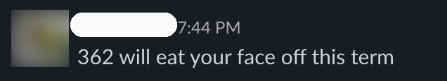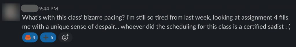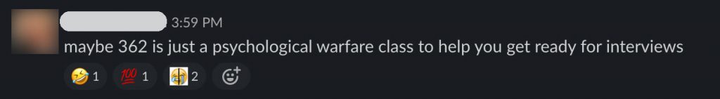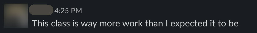 If you’re used to checking the Course Explorer to scope out a class ahead of time, be warned that most of the reviews for CS362 are from a previous version of the class. They’re not accurate anymore. In the meantime, here is some real (anonymized) commentary from the class Slack chat.