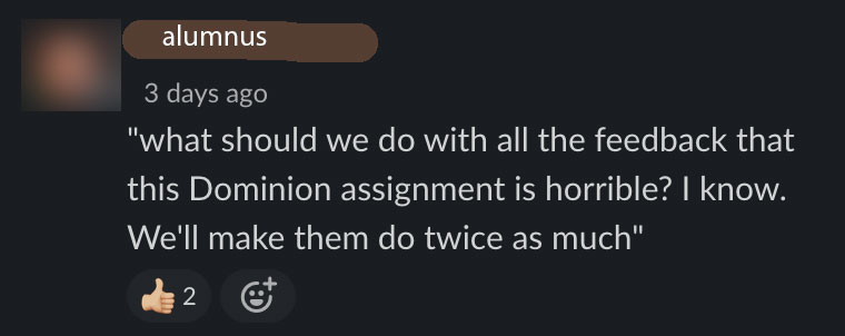 The one time I didn’t get an A on an assignment was because the TA marked me down 15% for exposing a crash bug that was in the dominion code to begin with. At that point I didn’t know what was real anymore.