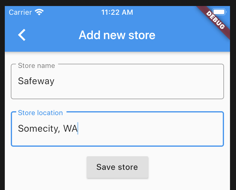 The ‘add a new store’ page is very similar to the ‘add a new shopping list’ page, so I copied and pasted the contents of new_shopping_list.dart into a newly created file, new_store.dart and built it out from there. I also updated the routes object to contain the new route in main.dart: