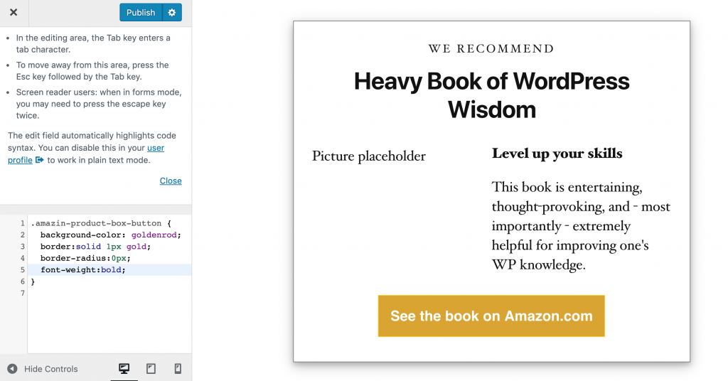 And finally, I modified the HTML that displays the actual in-post product box to echo out the setting value instead of a hard-coded string (also in amazin-product-box-plugin.php):