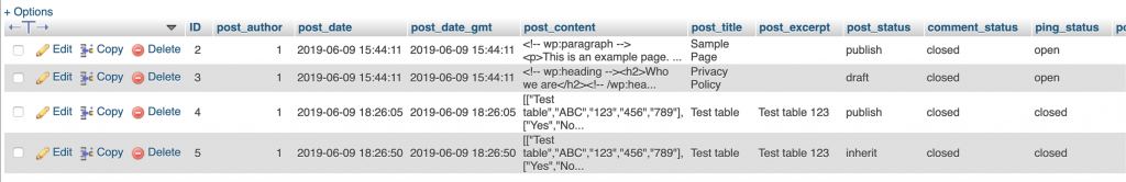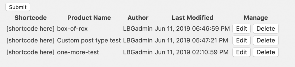 Before moving onto a new feature I took a moment to make a few more improvements. There is now a “Welcome” banner at the top of the plugin page, the shortcodes now display in full for each table row, I hid the search bar, and I fixed sorting by name (it used to not work at all because it was trying to run the query on ‘name’ instead of ‘post_title’).
