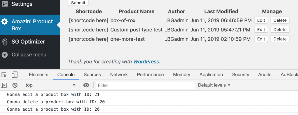 First, I read this guide on using JavaScript in a WordPress plugin. Then, I got to work on hooking up a console log to each button that logs the post ID of the product box associated with the table row.