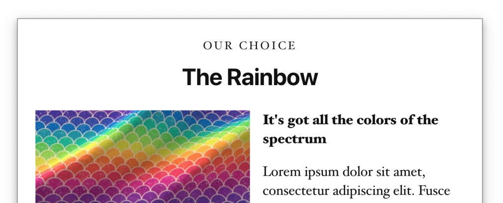 {"productName":"The Rainbow","productTagline":"It\'s got all the colors of the spectrum","productDescription":"Lorem ipsum dolor sit amet, consectetur adipiscing elit. Fusce pulvinar, leo at cursus finibus, lectus massa tincidunt nulla, vitae lobortis lectus orci vitae nunc. Aenean a elit mollis, iaculis felis sed, consectetur velit. ","productUrl":"http://wow.com","productButtonText":"See the rainbow on Amazon.com","productImage":"215"}