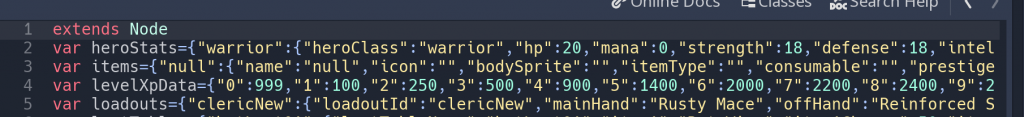 And now var loadouts = {…} exists in staticData.gd. Since staticData.gd is an AutoLoaded file, this means that my game’s code can retrieve a specific loadout by id like so, from anywhere in the project: